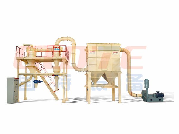 整套分级装置由气流分级机、旋风收集器、脉冲除尘器、高压引风机、电控柜等组成。气流分级机是带有二次进风及立式安装的大叶轮子的强制型分级机。工作时物料在引风机引力的作用下由下筒身进入,并上升至分区,由于分级叶轮转子的高速旋转,粒子既受到分级叶轮旋转产生的离心力,又受到引风机产生的向心力,当粒子受到的离心力大于向心力,分级径以上的粗粒子被甩到筒体内壁失速沿壁面下滑,外界二次风通过均匀分布在锥体上的进风口进入,对粗粒子进行产生风筛作用将混杂或粘附于粗料中的细粉分离干净。分离后的粗料由卸料装置收集排出分级机,分级径以下的细粉随气固二相流进入旋风收集器、脉冲除尘器收集下来,净化后的气体由引风机排出
