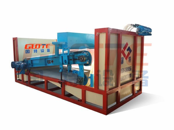 矿浆通过入料管道进入磁选机布料器,经过均匀分散后散落在磁板上部的卸铁皮带上。矿浆在重力作用下沿磁板的倾斜方向向下流动,矿浆中的铁磁物在磁板强大的磁场力作用下被牢牢吸附在卸铁皮带上,卸铁皮带在电机带动下沿磁板倾斜的上方转动,同时将吸附的铁磁性物带入卸铁区。铁磁性物在冲洗水的冲洗下进入尾矿斗被收集,无磁性矿浆沿磁板向下流动,流入精矿斗