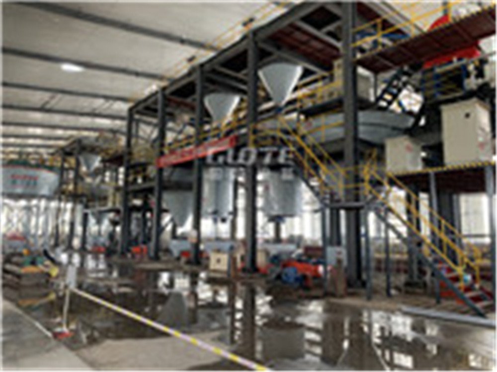 生产过程:铲车将原矿送入料仓,料仓尾部放置一台输送机,从尾部出来的原矿通过输送机经振动给料机均匀给入正下方的颚式破碎机(粗破),进行初步破碎。然后,产成的粗料由输送机输送至细碎机进一步破碎,细碎后的石料进振动筛,筛分出两种大小不同的石子、石块,超过规格的大石块返回细碎机,再一次破碎。筛下物料进入棒磨机,从棒磨机出来的物料经圆筒筛分级,筛上返回棒磨机。筛下物料进入受阻沉降机和水力分级机进行分级。分级后的成品经高场强板式磁选机和立环高梯度强磁选机进行除铁后。除铁后的精砂经脱泥斗脱水后打入精砂库。